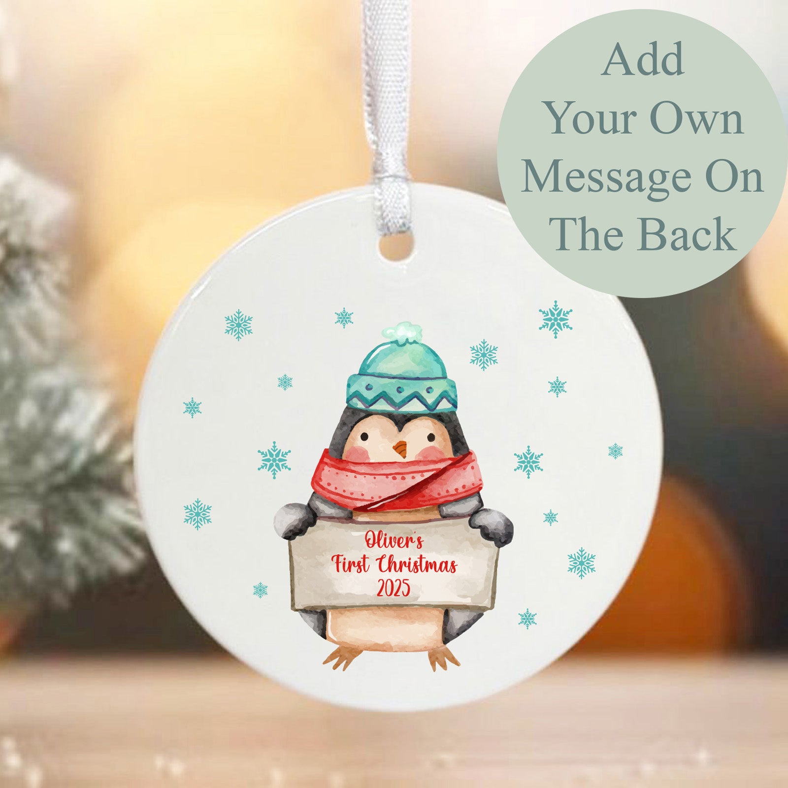 PERSONALISED GIFT - Celebrate your little one's special milestone with our Personalised Baby's First Christmas Bauble. This exquisite porcelain hanging tree decoration features a penguin holding a banner with a personalised name, making it a charming addition to your holiday décor. Customisable with your baby's name and year, this unique keepsake gift will be treasured for years to come.