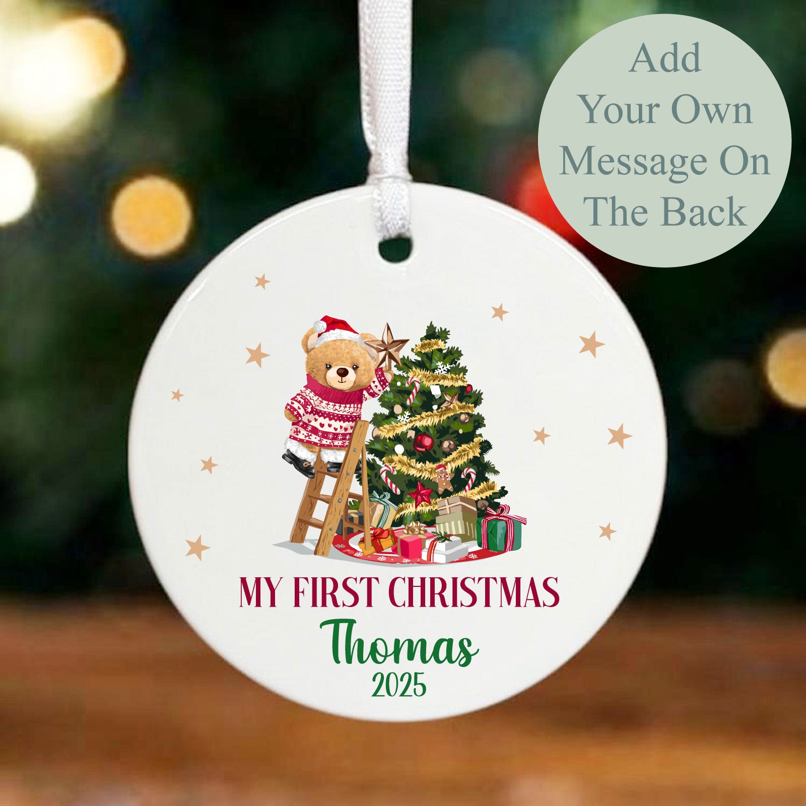 PERSONALISED GIFT - Celebrate your little one's special milestone with our Personalised Baby's First Christmas Bauble. This exquisite porcelain hanging tree decoration features a teddy bear design, making it a charming addition to your holiday décor. Customisable with your baby's name and year, this unique keepsake gift will be treasured for years to come.