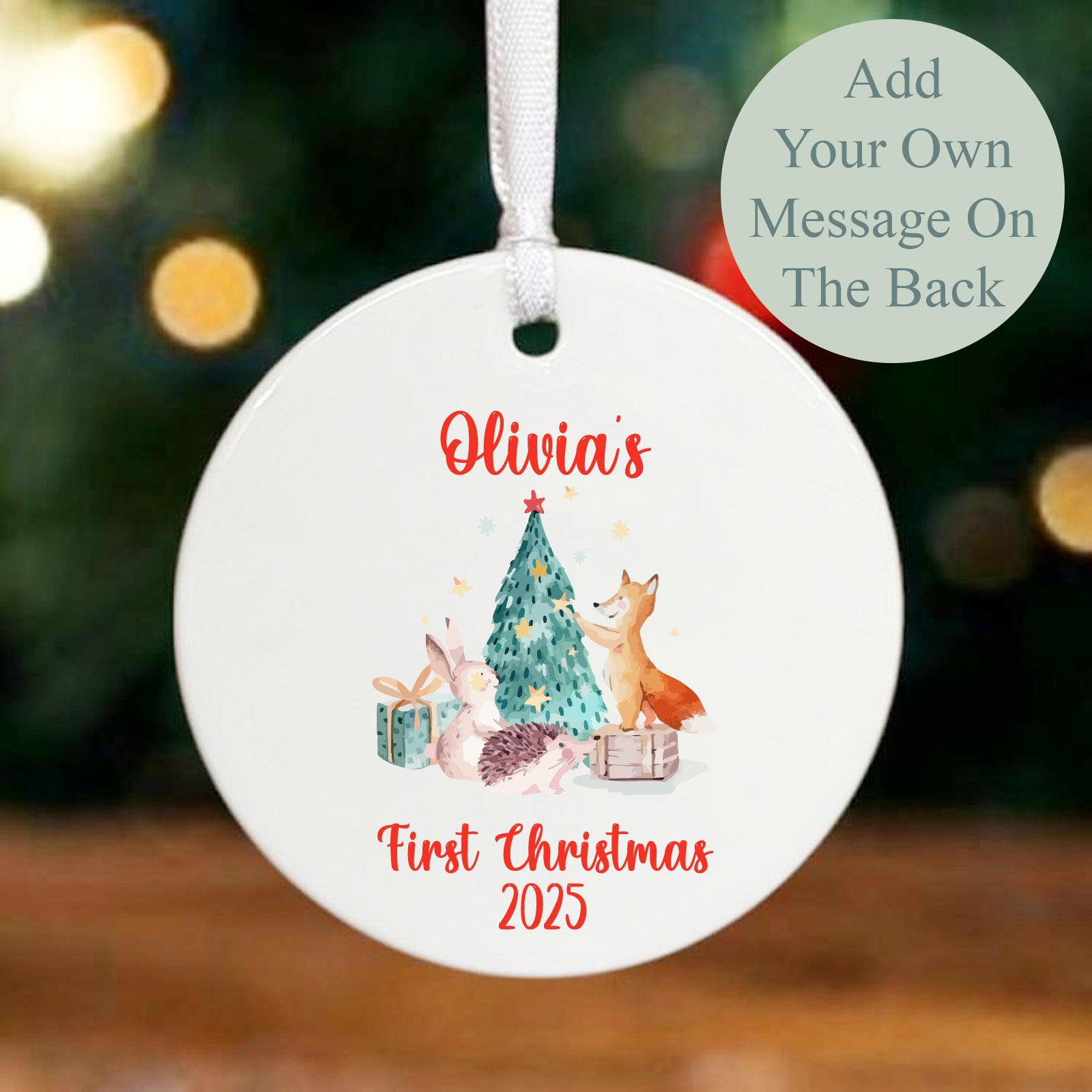 PERSONALISED GIFT - Celebrate your little one's special milestone with our Personalised Baby's First Christmas Bauble. This exquisite porcelain hanging tree decoration features a woodland animal design, making it a charming addition to your holiday décor. Customisable with your baby's name and year, this unique keepsake gift will be treasured for years to come.