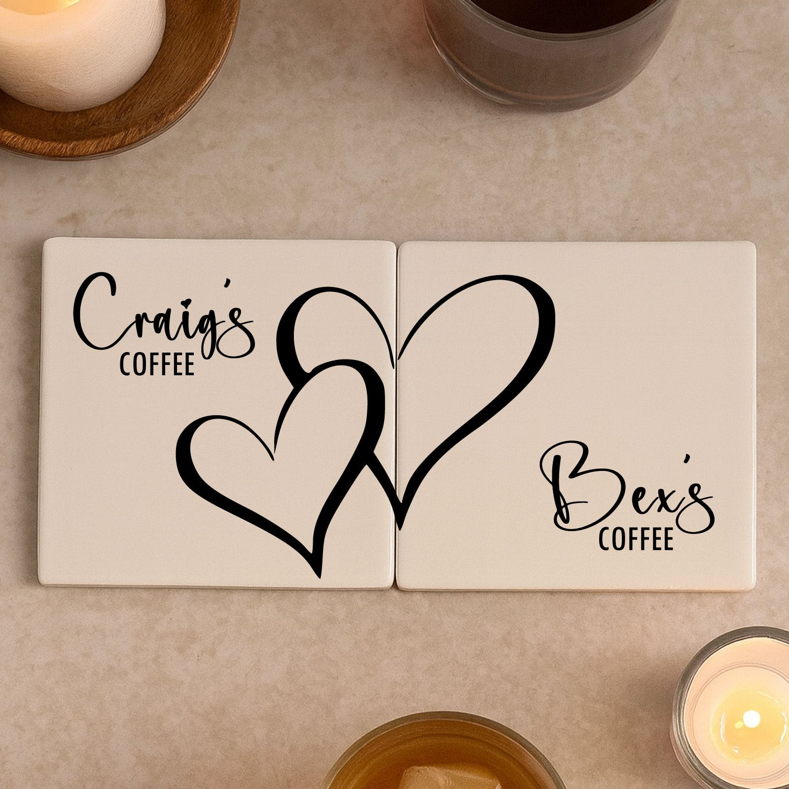 PORCELAIN COASTERS - A set of 2 Personalised Porcelain Couple Coasters with Heart Gift is a romantic and sentimental gift designed for couples. This set includes two porcelain coasters, each personalised with names or a special message, and they feature a heart design to symbolize love and togetherness. This couples coaster would make a fabulous gift for your partner or to give as a wedding present for the newly weds