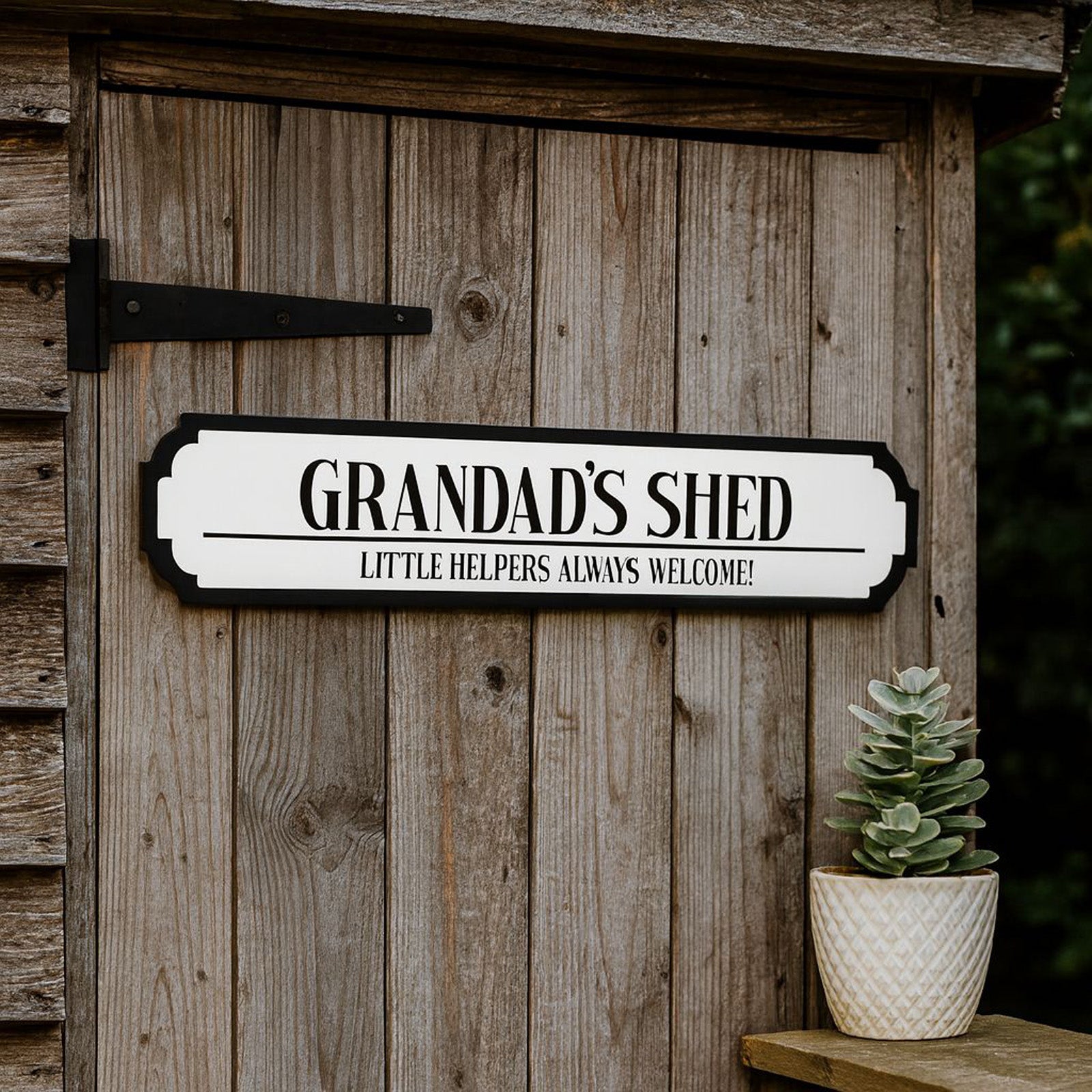 PERSONALISED SHED SIGN - Add a personal touch to Grandad's favorite space with this Personalised Shed Road Sign. Featuring the charming phrase "Grandad's Shed, 'Little Helpers Always Welcome!", this custom plaque is the perfect way to make any garden or workshop feel extra special. Whether it’s for the garden, garage, or backyard shed, this sign is a heartfelt addition to Grandad’s favorite spot, inviting family and friends to join him in his creative space.