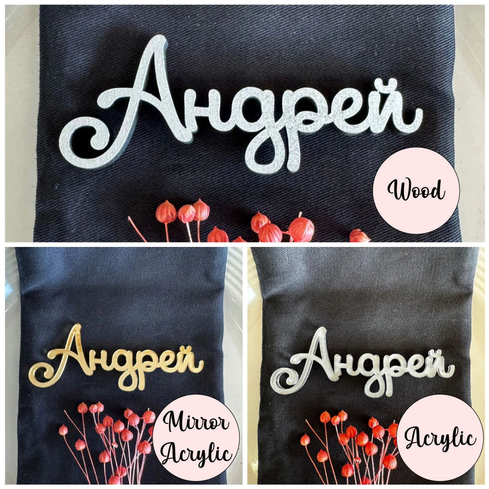 Create a unique and personalised touch to your wedding or event with these Cyrillic or Greek place setting names. You can choose between them being made in wood, acrylic or mirror acrylic. It could also be used to personalise any other items, such as a gift box or a photo frame etc. We are also able to do this for Latin character place names, for mixed nationality parties and celebrations.