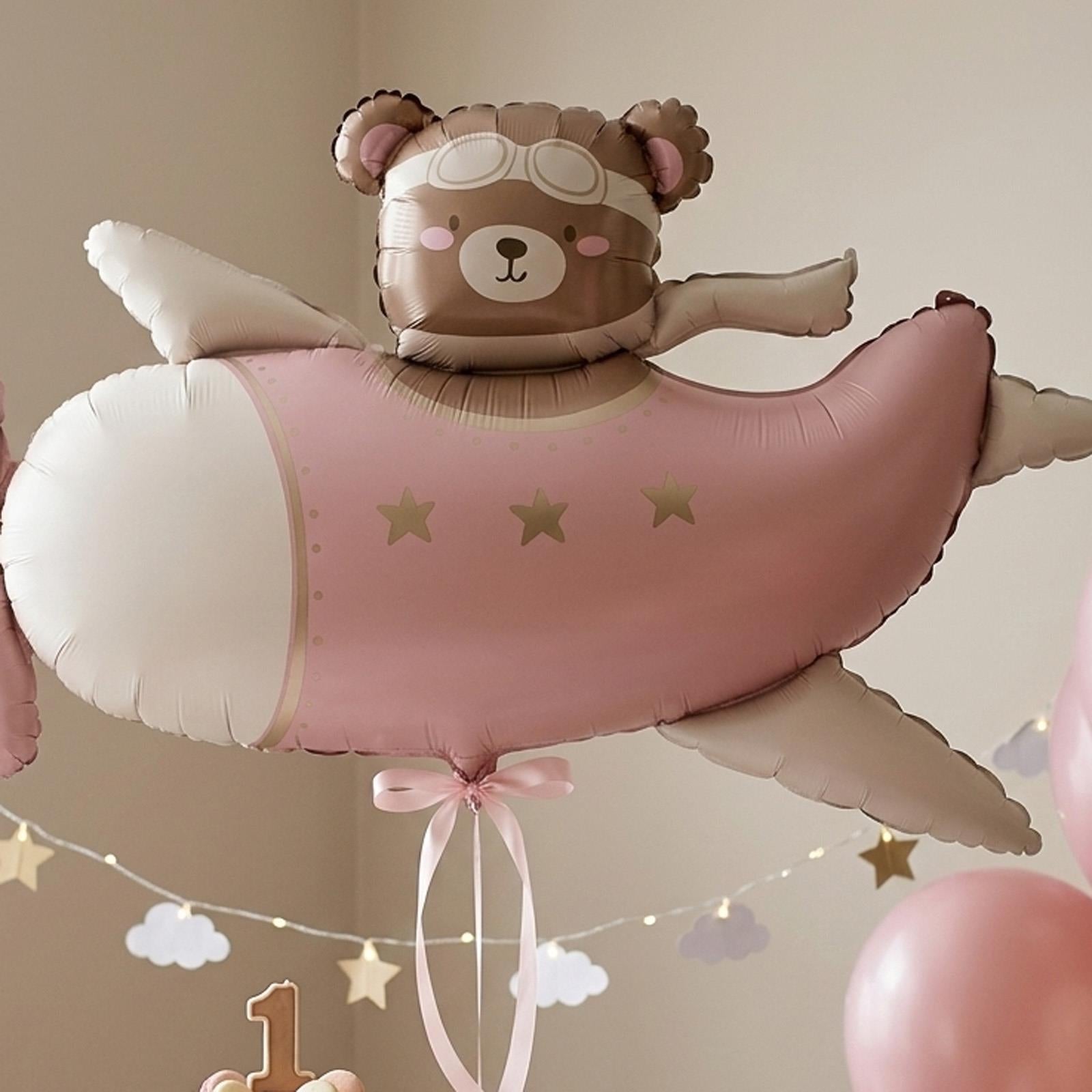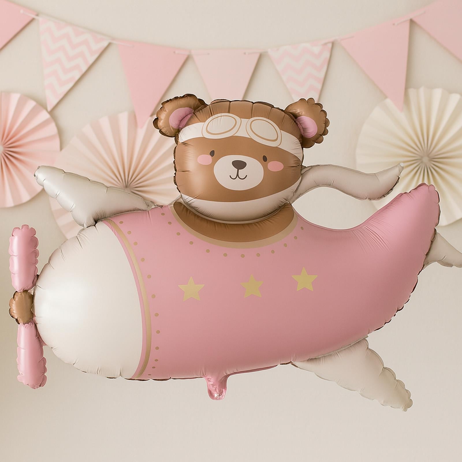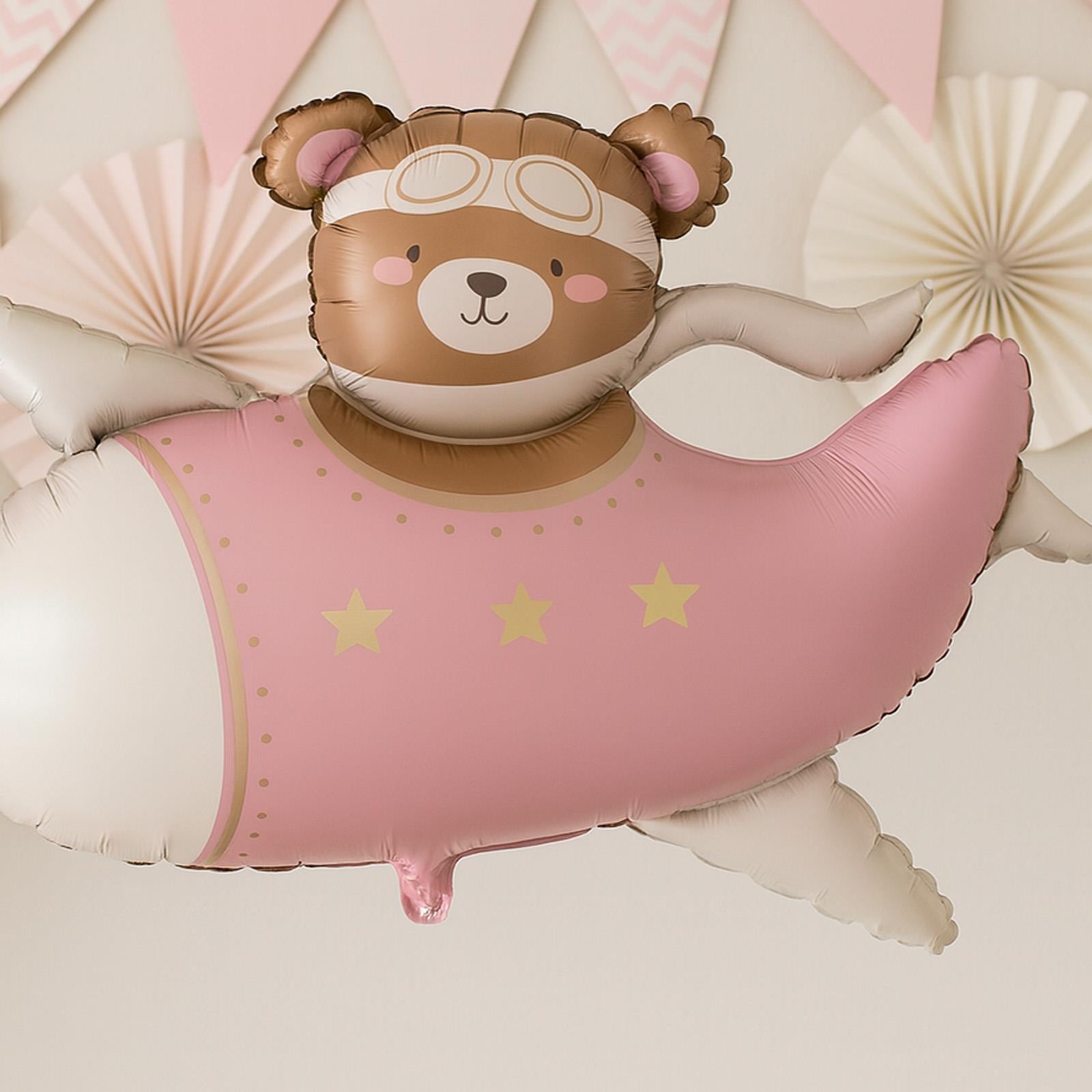 Cute pink bear airplane foil balloon for kids birthday parties and baby showers. Large 94x61cm decorative balloon for playful themed celebrations.