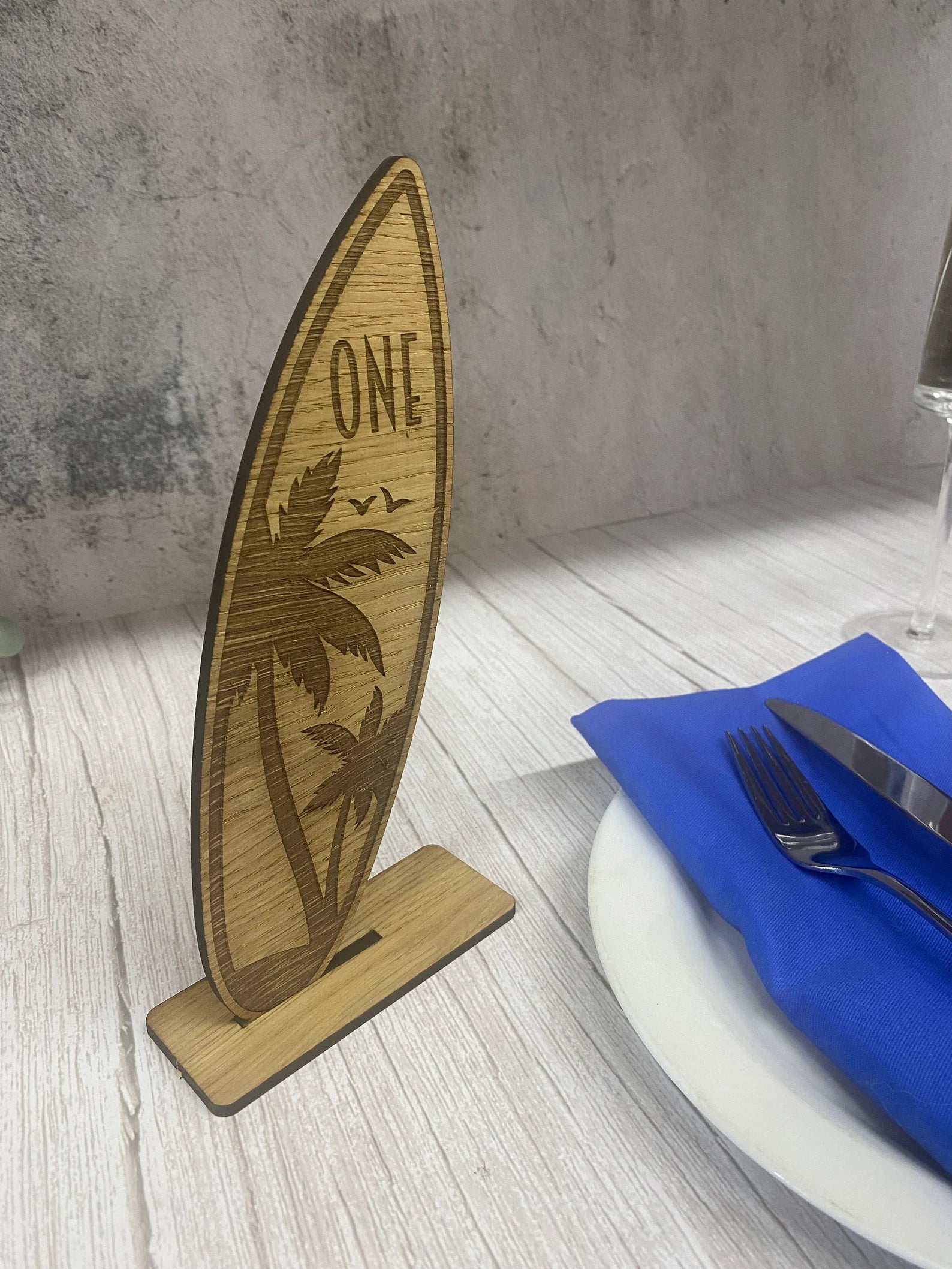 SURFBOARD TABLE NUMBERS - Set the stage for a beach-themed wedding with our Surfboard table numbers, personalised just for you with a name or number! Crafted from premium quality wood, each surfboard serves as a unique place setting for your guests, adding a touch of coastal charm to your special day. Let the waves of love and joy roll in as you create unforgettable memories with this delightful touch of seaside flair!