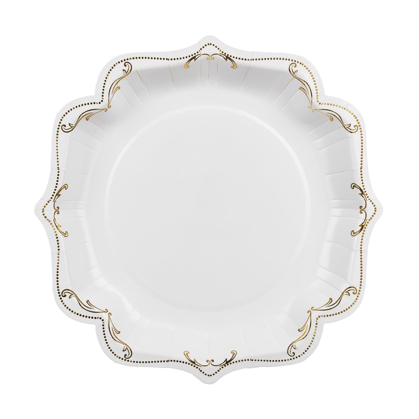 Elegant white and gold paper plates 26cm set of 6. Perfect for weddings, parties and special occasions. Stylish disposable tableware for easy entertaining.