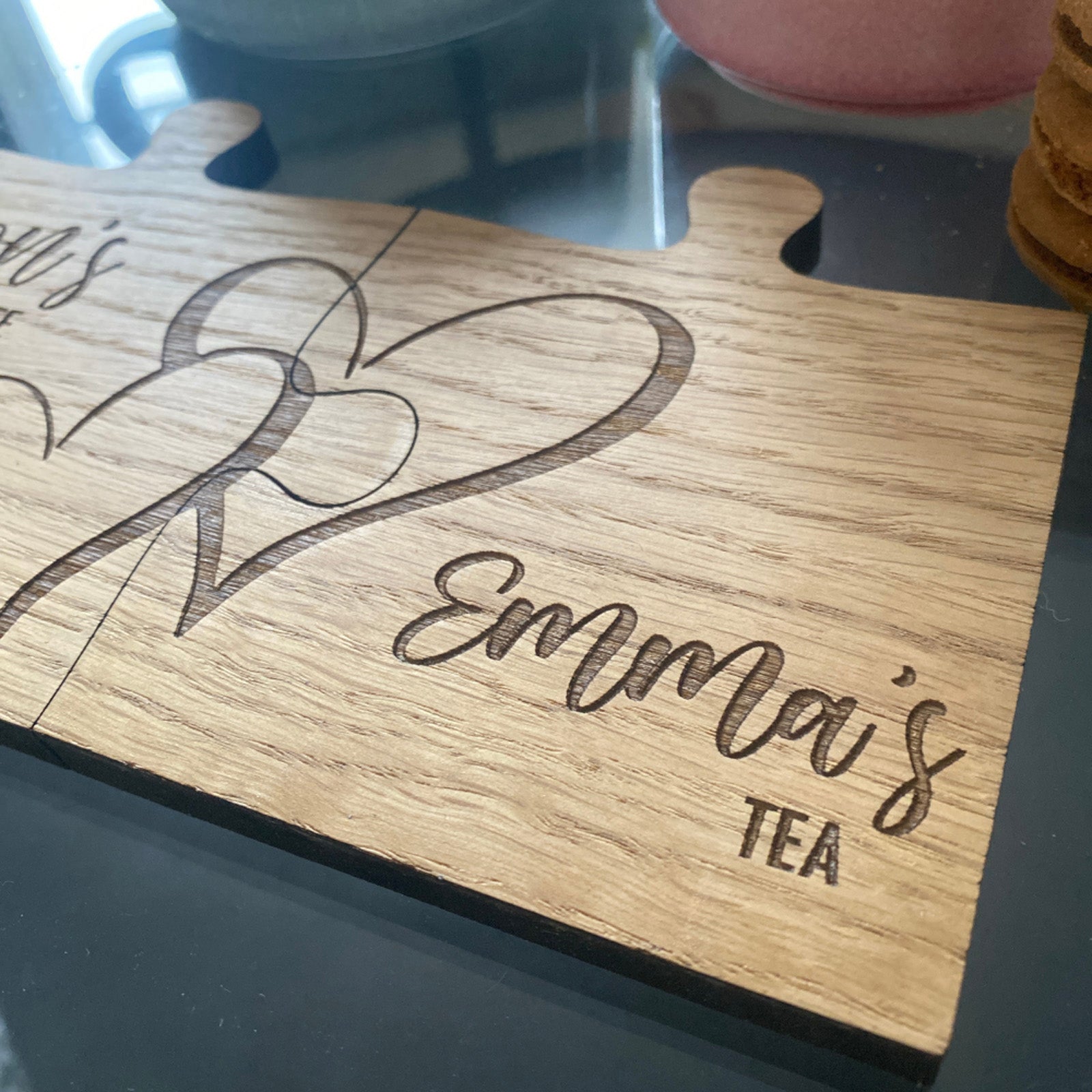 Discover the perfect blend of practicality and personalisation with our Oak Personalised Heart Jigsaw Coaster x2. This charming set of coasters is designed not only to protect your furniture from unsightly drink rings but also to add a touch of warmth and character to your home. Handcrafted from high-quality oak, each coaster features a unique jigsaw puzzle shape, creating a playful and distinctive element for your tabletop. Every piece can be custom-engraved with your choice of names or initials, accompanied by delicate heart symbols to enhance their romantic allure. Ideal for various occasions, including weddings, anniversaries, and housewarmings, these coasters make for a thoughtful and memorable gift. Key features include: